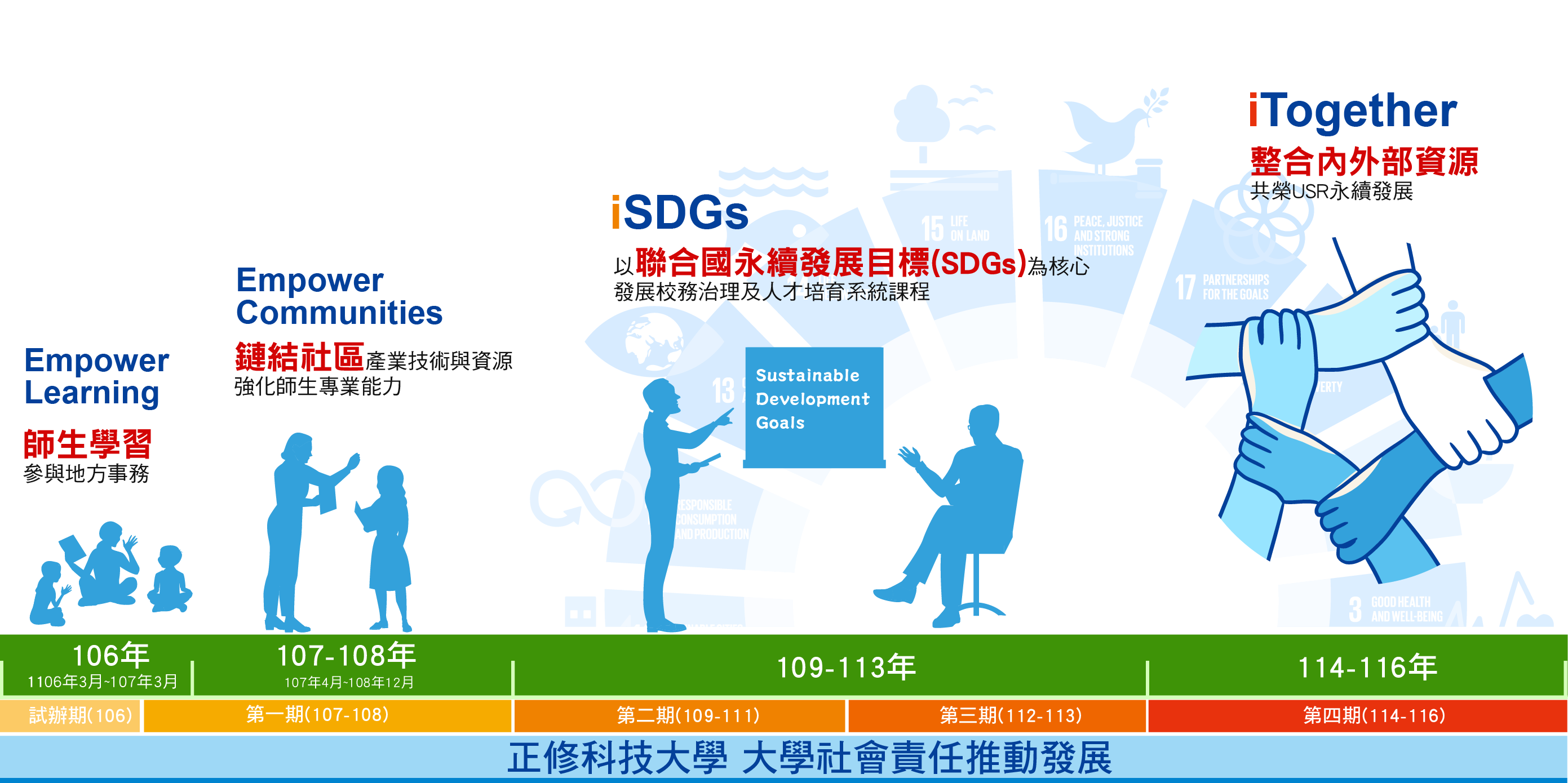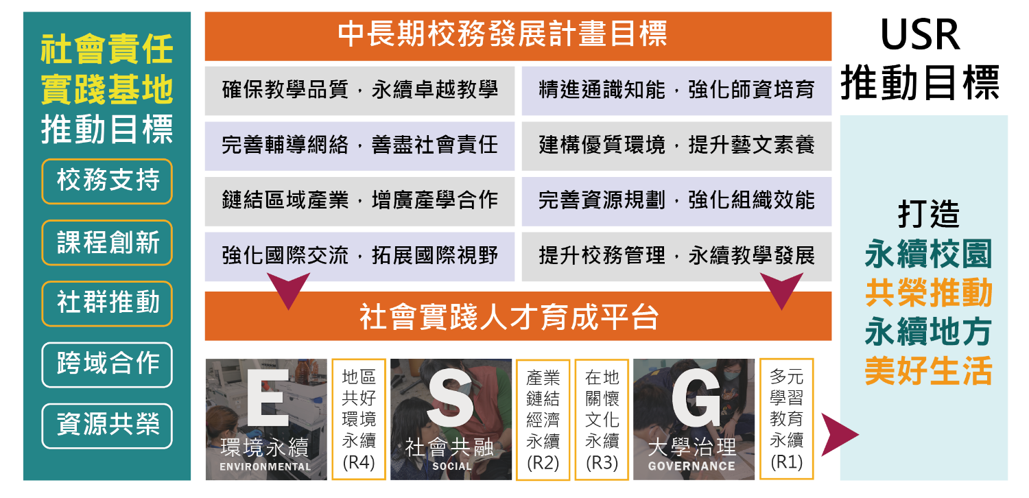 依據本校《校務發展計畫》與《高等教育深耕計畫:創新實踐.跨域整合.連結在地.接軌國際》進行整體USR藍圖規劃,本校114-116年推動3i賦能(iSmart ×iSDGs×AI),培育具備智慧應用能力、永續發展視野與AI賦能技術素養人才,USR將以以「永續發展」為核心,鏈結地區利害關係人,與師生共同推動及參與地方事務,促進學術與產業的雙向成長,及地方活化與資源共享,創造緊密的社區網絡,建構「打造永續校園,共榮推動永續地方美好生活」願景,以「培育具備社會責任與實務創新能力之『永續領域實踐人才』」為使命,提出「永續校園」、「永續地方」推動目標,結合「教育」、「經濟」、「文化」與「環境」永續發展主軸,推動區域永續發展。