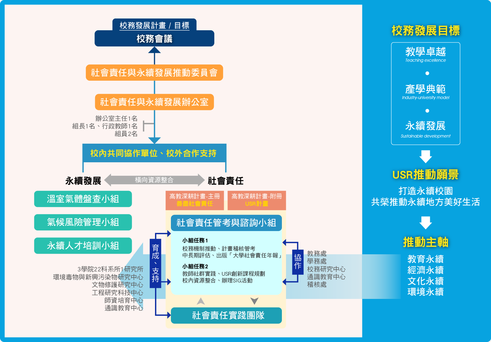 本校推動大學社會責任行政推動層級由上至下分別為「社會責任與永續推動委員會」、「社會責任與永續發展辦公室」、「大學社會責任實踐基地」,採用Top-down決策思維,以校務發展與社會責任中長期效益為基礎,推動績效管考、創新課程實踐、教師與夥伴社群機制落實,藉此基礎支持教師團隊媒合場域需求以落實計畫執行,於執行過程中導入Bottom-up model機制,藉由管單位與執行團隊間資源交流,滾動修正執行策略確保執行效益與目標契合度。